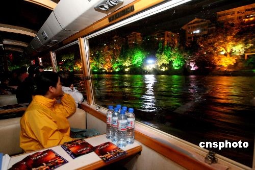 2008年桂林山水文化旅游節藝術巡游將于11月9日晚開啟序幕,眾多嘉賓云集參加多項活動。圖為11月8日晚,游客乘船欣賞桂林市區兩江四湖美麗夜景。中新社發 王麗南 攝
