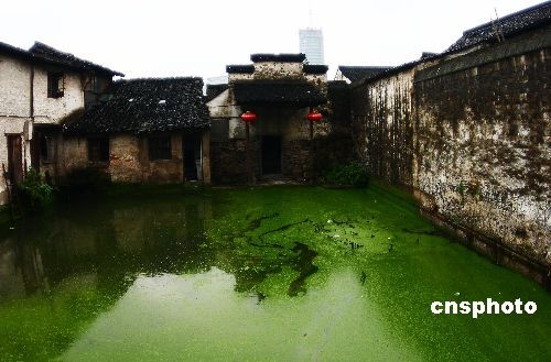 11月8日下午,位于浙江紹興市區的王羲之故宅前墨池一片綠色,據了解,這是由于藍藻和浮萍的侵襲而形成的。中新社發 李瑞昌 攝