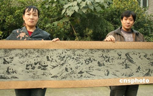 11月9日,楊雙全和妻子張智容展示自己完成的大型竹編“中華國寶”圖。楊雙全是四川青神縣西龍鎮(zhèn)農(nóng)民,為了表達(dá)四川農(nóng)民對北京奧運會成功舉辦的祝賀,作為中國竹編藝術(shù)之鄉(xiāng)農(nóng)民的楊雙全和妻子花了兩年多心血,于近日完成竹編精品“中華國寶”圖。該圖長5米,寬0.5米,以66只形態(tài)各異的熊貓和福娃以及奧運會徽五環(huán)組成。中新社發(fā) 堯遙 攝