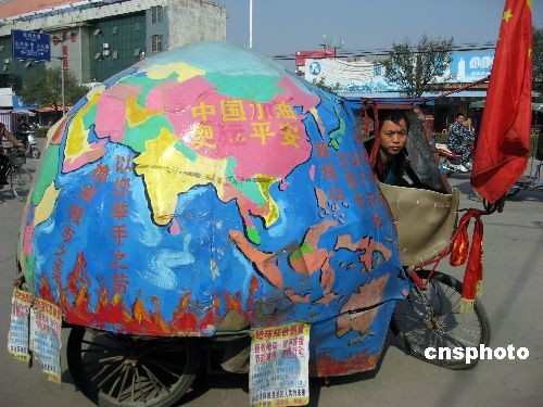 11月10日,一個地球模樣的三輪車來到安徽省亳州市宣傳環保,吸引市民駐足觀看。38歲的江西小伙蔣桂山自去年6月5日從江西九江開始,騎著自制的直徑一米的地球儀三輪房車宣傳環保,先后途經上海、天津等140個城市。之后,他來到安徽亳州講“環保”。蔣桂山預計用4年時間蹬著“地球車”走遍全國400多個城市,向人們宣傳節約用水、用電和能源,他想用這種特殊的方式引起人們關注環保。中新社發 張延林 攝