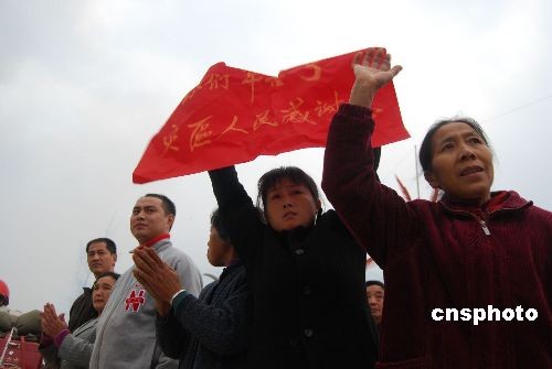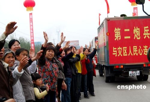 11月10日上午,在北茂公路擂禹段戰(zhàn)斗了180天的第二炮兵某工程團(tuán)撤離災(zāi)區(qū),踏上歸途,綿陽各界群眾到公路沿線為官兵們送行。據(jù)四川省軍區(qū)參謀長(zhǎng)張培敏少將介紹,這支部隊(duì)是迄今為止,堅(jiān)守四川災(zāi)區(qū)時(shí)間最長(zhǎng)的一支救災(zāi)部隊(duì),也是最后一支撤離的解放軍部隊(duì)。中新社發(fā) 胥輝 攝