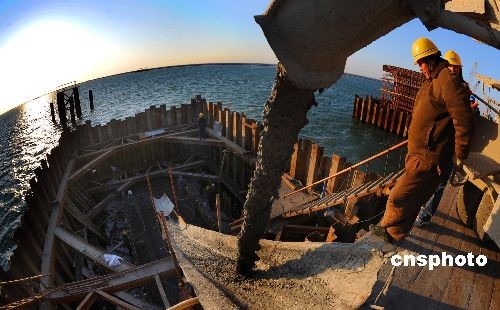 背景資料:曹妃甸特大橋是遷曹鐵路全線重點控制工程,全長7477.26m,為雙線橋梁,包括下部結構樁基1973根、橋墩臺243個,以及相應施工便道、筑島平臺填筑和跨1400m的納潮河段施工棧橋、平臺搭設;上部結構現澆4處15孔共339.44m,架設預制梁227孔。跨納潮河段水深6至18m,納潮河主跨連續箱梁施工是重中之重,原設計為(40+64+40)分段懸臂澆注施工。該工程于2008年4月中旬開工,面對工期緊、任務重、安全和質量風險大等諸多重難點問題,從集團公司到項目部各級領導高度重視,層層發動,統一思想;著力加強現場組織領導力量,加大施工現場人力、物力的投入;不斷優化施工方案,嚴控布控,精心組織,科學施工,全力攻堅。先后組織了“百日大干,任務過半”、“決戰60天,貫通曹西線”等建功立業競賽活動,目前已完成實物工作量95%,預計2008年底全線貫通。中新社發 朱鴻山 攝