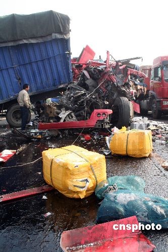 11月14日6時30分,由于受團霧影響,滬昆高速江西東鄉縣195KM--196KM處往南昌方向同時間發生5起汽車追尾事故,造成16輛貨車追尾,高速公路交通一度受阻。據了解,事故已造成5人死亡、10人受傷。經過當地有關部門全力搶救,到上午10時,滬昆高速公路事故路段實行交通疏導分流,恢復部分交通,目前事故還在進一步清理調查中。中新社發 何江華 攝