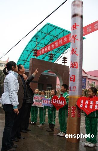 11月17日,小學生制作的巨無霸“香煙”引來過往市民好奇的目光。當日是“世界戒煙日”,山東棗莊市回民小學學生用舊報紙和卡紙等制作了一支3.6米高的巨無霸“香煙”模型,豎立在學校大門旁,并組成戒煙小分隊,勸告煙民戒煙。中新社發 吉 喆 攝