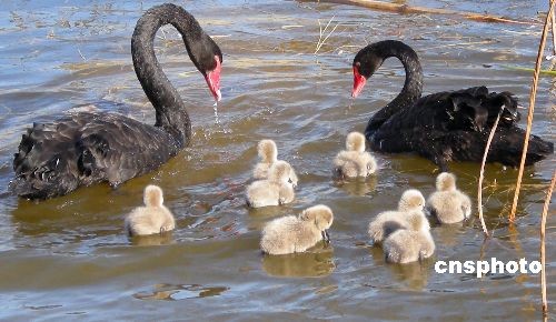 11月27日,北京陽光燦爛, 8只新近出生的黑天鵝寶寶跟隨“爸爸”、“媽媽”在圓明園的荷塘內(nèi)游弋覓食,它們可愛的姿態(tài)吸引了眾多的游客駐足觀賞。中新社發(fā) 玉龍 攝