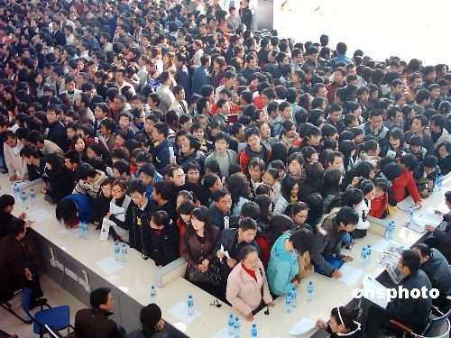 貴陽市某人力資源市場舉行的首場招聘會上,前來求職的返鄉(xiāng)農(nóng)民工和大學(xué)生擠滿了整個人才市場。經(jīng)過精心籌備,使當(dāng)天進場招聘的單位達80余家,提供保安、保潔、廚師、服務(wù)員、焊工、建筑等崗位800多個。由于近段時間從外省返鄉(xiāng)的農(nóng)民工不斷增多,即將畢業(yè)的大學(xué)生和社會失業(yè)人員的求職需求也比較大,使得當(dāng)天的招聘會異常火爆,進場招聘和求職的人員達到數(shù)千人,將人才市場擠得水泄不通。中新社發(fā) 彭年 攝