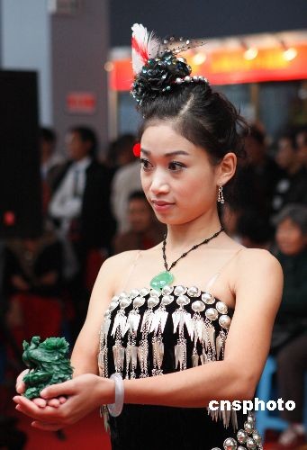 圖為景頗族少女在展示一款玉雕作品。