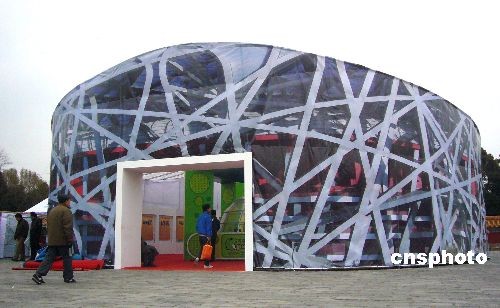 2008年12月3日,由噴繪布模擬搭建的山寨版“鳥巢”展廳正式在北京地壇書市的方澤壇活動區亮相,游客競相入內參觀。不過這個建筑可不是用來進行體育比賽的,本屆書市的展覽、法律咨詢等活動都在這里進行。中新社發 玉龍 攝