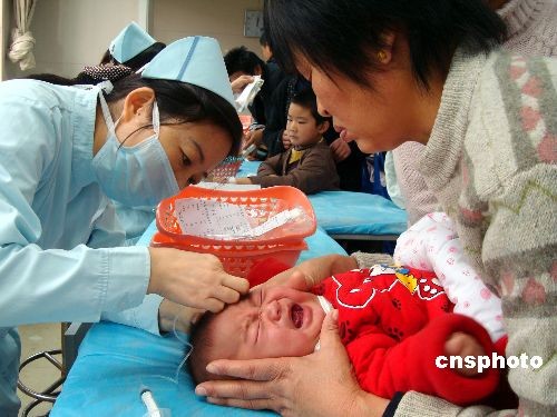 2008年12月4日,蘇州市兒童醫院的醫護人員在為患兒輸液。當日,受北方冷空氣影響,蘇州氣溫大幅下降,來醫院就診的患兒也比平時增加四成左右,大部分患兒是由于受涼而引發感冒、發燒等不適。中新社發 王建康 攝