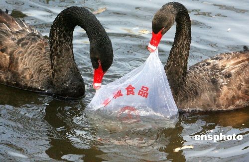 2008年12月6日,冬日暖陽下的蘇州動物園迎來不少游客。然而,在該園池塘里戲水游弋的幾只黑天鵝面對少數不文明游客亂扔并漂浮水面的塑料薄膜食品袋,既好奇又犯了難:天鵝們仿佛想從中尋找食物而用嘴含啄、吞咽,或竭力撕扯也無濟于事。后來,在場目睹此情景的幾名好心游客為以防不測,請來飼養管理人員將食品袋從水中一一撈起。 蘇州動物園飼養管理人員敬告,游客應文明游園,善待動物,切莫如此戲弄或傷害可愛的黑天鵝。中新社發 蘇秀 攝