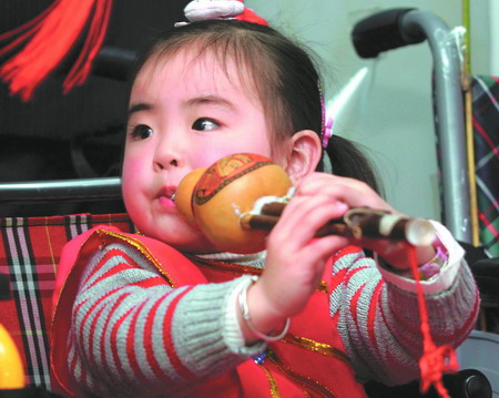 “總理讓路的女孩”小馨懿在吹葫蘆絲