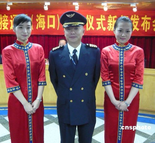 十二月二十日,海口-臺(tái)北將首開直航航線。海南航空為順利完成此次首航,特別推出精干的機(jī)組人員。機(jī)長蒲明(中)曾執(zhí)飛2005年兩岸春節(jié)包機(jī)最后一個(gè)航班。乘務(wù)長和頭等艙乘務(wù)員在去年以來都曾執(zhí)飛過兩岸中秋、春節(jié)包機(jī)。中新社發(fā) 王辛莉 攝