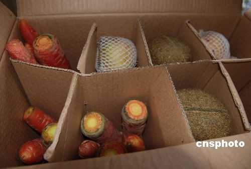 12月23日,贈臺大熊貓“團團”、“圓圓”離開雅安碧峰峽前往成都雙流國際機場。臺灣人民期盼已久的“團團”、“圓圓”,終于踏上了赴“寶島”臺灣之路。圖為大熊貓途中所用食物。中新社發 陳學梅 攝