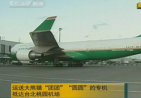 12月23日下午5時(shí)許,運(yùn)送大熊貓“團(tuán)團(tuán)”“圓圓”的專機(jī)抵達(dá)臺(tái)北桃園機(jī)場。點(diǎn)擊觀看“團(tuán)團(tuán)”“圓圓”赴臺(tái)報(bào)道圖片專輯