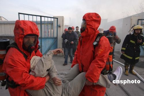 12月27日,江蘇連云港海州區人防辦聯合消防、安監、衛生、環保等單位在海州區德邦精細化工廠舉行學品事故處理應急演練,旨在通過演練,提高企業節日期間突發性事故應急處置能力。中新社發 穆道勇 攝
