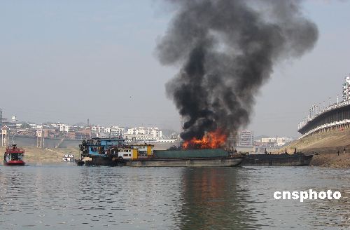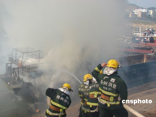 1月3日13時(shí)20分許,廣西梧州桂江上一艘貨船突然起火。由于火勢大,貨船噴出的火苗很快點(diǎn)燃?吭谂赃叺牧硪凰邑涊啠⑽<班徑10多艘貨輪。梧州消防支隊(duì)調(diào)集水上中隊(duì)和河?xùn)|中隊(duì)官兵奮戰(zhàn)近50分鐘,終于將大火撲滅,事故中無人員傷亡。據(jù)了解,當(dāng)時(shí)起火貨船靠岸后船主上岸辦事,不料隨后船艙起火。中新社發(fā) 何永崇 攝