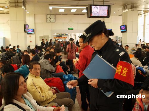 1月4日消息,廣州鐵路公安在對乘客的車票進行檢查。廣州鐵路采取了一系列有力措施,大力凈化旅客的購票環境和乘車秩序,防止票販從中得利,侵犯旅客和農民工權益,保障旅客乘車安全。中新社發 金槍花 攝
