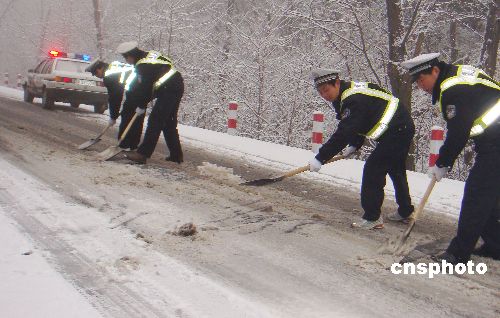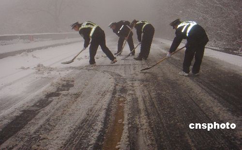 2009年1月4日,安徽省巢湖市含山縣交警大隊(duì)太湖山中隊(duì)的干警正在太湖山險(xiǎn)要路段鏟雪。元月3日夜間,該縣迎來(lái)今冬第一場(chǎng)雪,部分路段已積上厚厚的冰層。為了給即將來(lái)臨的春運(yùn)工作打下堅(jiān)實(shí)的基礎(chǔ),維護(hù)良好的道路交通秩序,給廣大群眾營(yíng)造良好的交通環(huán)境,當(dāng)天一大早,含山縣交警大隊(duì)太湖山中隊(duì)組織民警上路巡邏,重點(diǎn)加強(qiáng)對(duì)山路的安全隱患排查清理。中隊(duì)民警鏟除幾個(gè)連速?gòu)澋郎系暮駥颖⒂脪咧銓㈢P除堆積的冰雪清掃出路邊,保證了過(guò)往車(chē)輛的安全通行。中新社發(fā) 豐成 攝