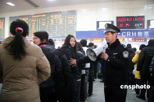 2009年1月5日,在沈陽北站售票大廳兩名鐵警正在對“重點旅客”進行檢查。據沈陽鐵路警方透露今年春運從1月11日開始至2月19日結束,節前15天,節后25天,共計40天。由于今年新年、春節間距時間較短,使農民工、學生和探親流交織在一起,呈現出啟動早、持續時間長的特點,為創造和諧的春運治安環境,沈陽鐵路警方開展了以春運安全為重點內容的“鐵鷹”、“藍盾”、“利劍”和“天網”專項行動。以打擊盜搶旅客財物、制販假票及拆盜、割盜等各類危害運輸車輛的違法犯罪活動,全力維護群眾的合法權益。中新社發 趙敬東 攝