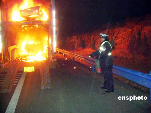1月10日凌晨,一輛運(yùn)載著8輛海南馬自達(dá)轎車的大貨車,在湖北樊魏高速公路上無故起火,除搶救出一臺轎車外,其余7臺“海馬”燒成空殼。原來,駕駛員李某準(zhǔn)備將8輛海南馬自達(dá)3型轎車從重慶運(yùn)往吉林,途中發(fā)現(xiàn)裝有兩層車的下層,有一臺馬自達(dá)轎車起火,李某驚慌之下急忙救火。在民警的幫助下,駕駛員搶出一輛未著火的轎車,其余7輛轎車全部燒得只剩空殼。民警現(xiàn)場調(diào)查發(fā)現(xiàn),火是起自下排一臺小轎車,懷疑是轎車自燃,但轎車本身并未發(fā)動,究竟如何起火,讓民警和司機(jī)都納悶不已。目前,該事故成因正在調(diào)查中。 中新社發(fā) 李得榮 攝