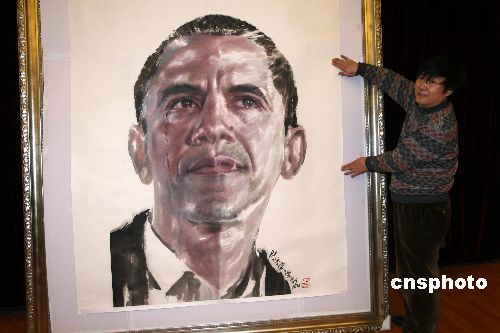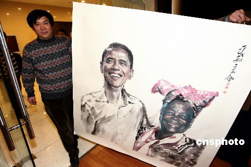 1月20日,中國(guó)著名畫(huà)家于成松大型中國(guó)畫(huà)《朗朗青空》在北京與觀眾見(jiàn)面。作品以?shī)W巴馬為原型,圖中奧巴馬面掛激動(dòng)的淚花,頭微微仰望遠(yuǎn)方。于成松說(shuō),想通過(guò)創(chuàng)作該幅作品,加深中美兩國(guó)人民的了解和友誼。畫(huà)家同時(shí)創(chuàng)作了以?shī)W巴馬和他的肯尼亞奶奶為原型的作品《盈盈厚土》。中新社發(fā) 杜洋 攝