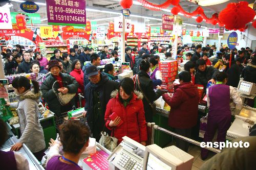 1月24日,北京市懷柔區“年貨”市場人潮涌動,市民紛紛走進食品超市選購年貨,呈現出紅紅火火過大年的喜慶景象。中新社發 卜向東 攝