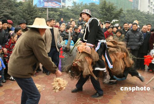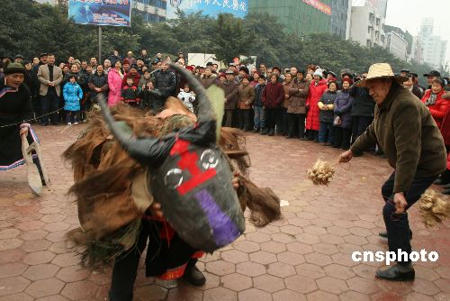 1月30日,農(nóng)歷正月初五,四川省洪雅縣瓦屋山鎮(zhèn)復(fù)興村84歲村民毛清全帶領(lǐng)該村10多名村民,到眉山市城區(qū)表演當?shù)孛袼住芭簾簟薄?/p>
