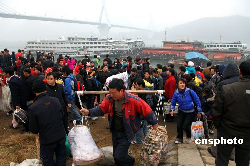 2月3日農歷正月初九早8時,長江宜昌港大公橋客運碼頭四條躉船無一客人、無一客船,9時,9艘客船同一船閘、同時停泊宜昌港,一時間,涌入宜昌港口的出川大軍疏散成“井噴”之勢。宜昌海事、公安、港口等部門聯動執(zhí)法,35分鐘時間內緊急疏散4500余人,全部是出川農民工。據統計,三峽春運期間,常年旅客進出客流量約50萬人次,其中外出農民工乘船超過40余萬人次。據悉,三峽庫區(qū)是長江干線跨省春運重點航線,而這一航線又是中國內河農民工乘船的專營航線,節(jié)前單邊返鄉(xiāng)過年,節(jié)后單邊出川進城打工,客船單邊旅客、客船高度集中,是中國內河不多見的春運現象。中新社發(fā) 望作信 攝