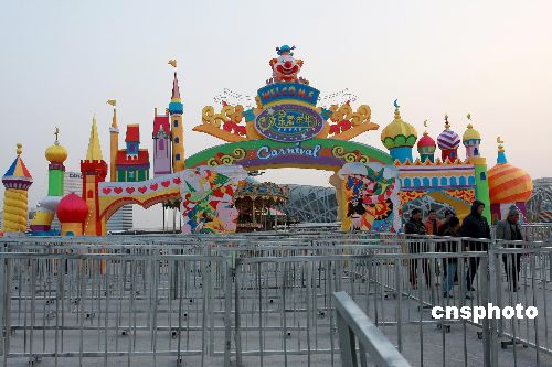 2月3日,北京奧運中心區環球嘉年華的各項準備工作正在加緊進行中。距離鳥巢僅200米的“環球嘉年華”項目面臨著嚴格的審批,由于手續尚未辦妥,原定于正月初五的開放時間被延遲至月底。環球嘉年華是奧林匹克公園公共區的首個大型室外娛樂項目,占地5萬平方米,設有近百個游樂項目。中新社發 鄭雄增 攝