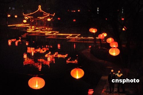2月7日晚在山東省棗莊市山亭區太清湖公園內拍攝的元宵燈海。連日來,山東省棗莊市山亭區太清湖公園內張燈結彩,喜迎元宵佳節。夜幕下的湖中倒影璀璨繽紛,整個公園仿佛燈的海洋。中新社發 李宗憲 攝