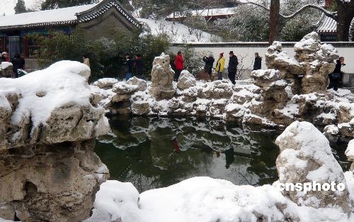 2月19日,北京普降瑞雪,白雪皚皚的京城吸引眾多游客拍攝雪景。圖為雪后的京城皇家園林北海。中新社發 錢興強 攝