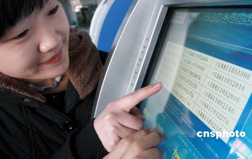 2月21日,中國移動3G手機“188”號段放號進入第二天,北京市民在營業(yè)廳內的自動終端前挑選自己滿意的手機號碼。2月20日起北京移動正式對188號段進行放號,188號段SIM卡是特別針對3G終端,只能在移動3G終端上使用,北京的手機用戶開始進入了3G時代。中新社發(fā) 鄭雄增 攝