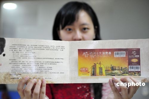2月23日,10萬冊《杭州市市民消費券珍藏冊》在杭州公開發行。1月20日起,杭州市向全市六城區67萬特殊人群發放了1億元消費券,在過去的一個月內,已經十分有效地達到了“保障民生,拉動消費”的目標。在此前提下,為滿足廣大市民珍藏消費券,保存這份特殊記憶的要求,市財政部門特別制作并發行10萬冊《杭州市市民消費券珍藏冊》,每冊收藏五張“杭州市民消費券”,每張面值20元,價值100元,整冊發行價亦為100元人民幣。冊內消費券不僅具有收藏價值,也可以憑券消費,同時享受商家提供的優惠服務。中新社發 李忠1 攝