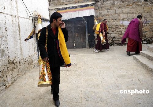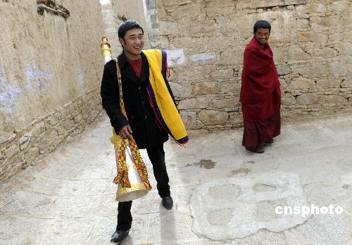 2月24日,藏歷年三十,拉薩哲蚌寺內(nèi)穿著時(shí)髦的拉薩哲蚌寺喇嘛群培格桑剛剛跟老師學(xué)習(xí)完吹法號(hào)的技法,在藏歷新年的佛事活動(dòng)中,他將上陣吹響法號(hào)。為僧已經(jīng)十多年的群培格桑喜歡偶爾穿著美觀的便裝。中新社發(fā) 廖攀 攝