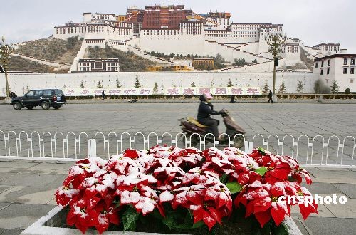 2月25日,藏歷新年初一,凌晨拉薩迎來藏歷新年的第一場雪,為節日增添祥和氣氛,布達拉宮廣場更顯壯美。中新社發 劉震 攝