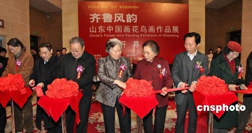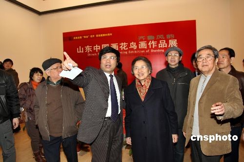 2009年2月25日上午,為慶祝全國(guó)“兩會(huì)”召開(kāi),迎接祖國(guó)60周年華誕,由中共山東省委宣傳部、山東省文化廳、山東省文聯(lián)主辦,山東省美協(xié)承辦的“齊魯風(fēng)韻--山東中國(guó)畫(huà)花鳥(niǎo)畫(huà)作品展”在中國(guó)美術(shù)館開(kāi)幕。開(kāi)幕式由山東省美協(xié)常務(wù)副主席兼秘書(shū)長(zhǎng)孔維克主持,全國(guó)人大原副委員長(zhǎng)何魯麗、全國(guó)政協(xié)原副主席郝建秀、中共中央組織部原部長(zhǎng)張全景、文化部副部長(zhǎng)王文章、山東省人大副主任溫孚江等領(lǐng)導(dǎo)出席了開(kāi)幕式。中新社發(fā) 王保勝 攝
