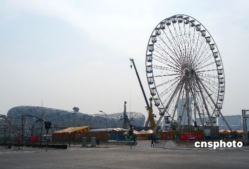 2009年3月10日,在北京奧林匹克公園“鳥巢”東北角,摩天輪、海盜船、太陽神車等在內(nèi)的娛樂設(shè)施已經(jīng)搭建完畢,目前正在加緊調(diào)試中,預(yù)計(jì)將于本月中旬開業(yè)迎客。據(jù)悉,此次嘉年華不同于前幾年舉辦的環(huán)球嘉年華活動,包括包括海盜船等在內(nèi)的40個(gè)機(jī)動游樂項(xiàng)目和56個(gè)競技游樂項(xiàng)目會給游客耳目一新的感覺,而且隨著季節(jié)的更替和游客喜愛程度的不同,這些大型游樂設(shè)施會定期替換。中新社發(fā) 玉龍 攝