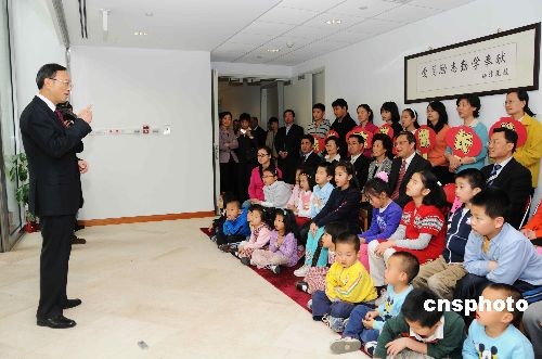 當地時間三月十二日,正在美國訪問的中國外交部部長楊潔篪來到中國駐美大使館視察中國250多家駐外使領館中的一所學!v美使館陽光學校。楊潔篪在和學校孩子們交談時鼓勵他們學說中國話,學寫中國字,學做中國人,并為陽光學校題寫校訓:“愛國勵志勤學奉獻”。圖為楊潔篪在和陽光學校老師和孩子們交流中。 中新社發 邱江波 攝