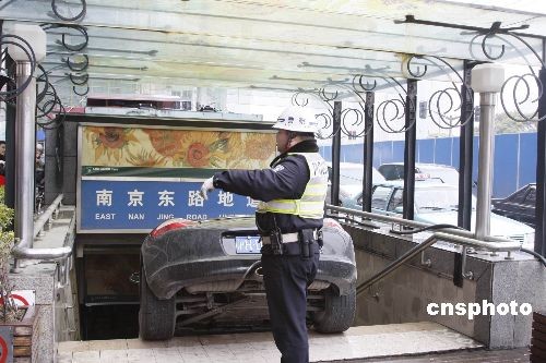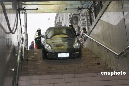 三月十三日下午一點左右,一輛保時捷豪華跑車,誤打誤撞駛入上海“外灘十八號”著名老建筑門前的“南京東路人行地道”內,女司機在發(fā)現(xiàn)是人行通道后趕緊剎車。在搶險過程中,一名上前幫忙牽引的工人被擠壓成重傷。中新社發(fā) 宣克炅 攝