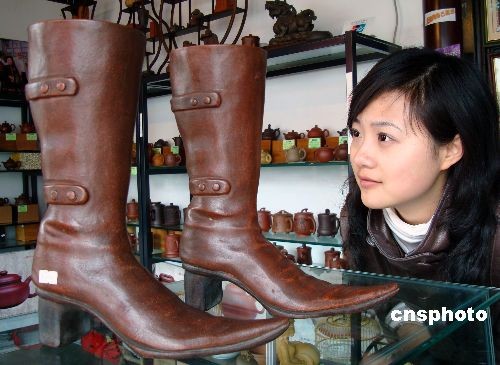 2009年3月13日,江蘇蘇州一紫砂工藝品商店內(nèi)擺放的“紫砂女靴”工藝品吸引了許多顧客的目光。這些由宜興紫砂工藝師采用全手工方式制作的“紫砂女靴”惟妙惟肖,受到顧客的青睞。中新社發(fā) 王建康 攝
