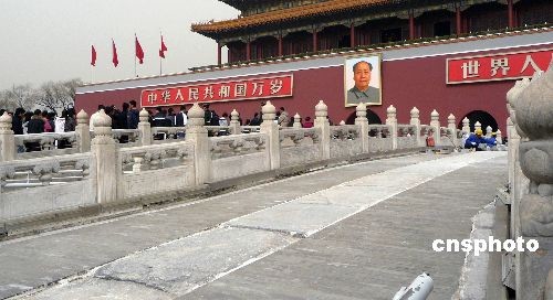 背景資料:為迎接新中國成立60周年,天安門管委會從2009年2月18日起對金水橋實施保護修繕,工程擬于2009年5月1日前完工,并整體對外開放。 中新社發 玉龍 攝