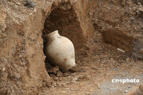 3月16日,施工人員在正在興建的安徽巢湖北外環施工工地發現兩座古墓。發掘的兩座古墓被確證為東漢晚期墓,其中一古墓葬為土坑墓,另一座為磚坑墓。據該市文管所同志介紹,這兩座漢墓均被盜過,而且被盜一空,在發掘時,發現盜墓賊留下一個很大的盜洞,直通墓中央。從盜墓賊盜墓的舉動和第二座漢墓墓磚結構及墓磚上的花紋判斷,此墓墓主應該有些身份,多少有些隨葬品,然而,發掘人員除了發掘出一些瓦罐的碎片,挖出惟一一只完整的陶罐。此只陶罐不是在墓坑挖出的,而是在墓坑外二十公分處。據文管所同志分析,此罐可能是后人祭祀留下的,或是盜墓賊丟下的。中新社發 李遠波 攝