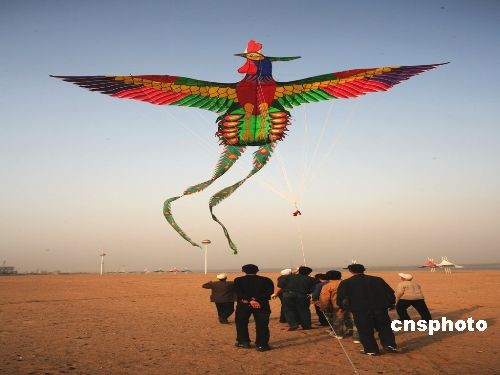 3月18日下午,一只巨型鳳凰風箏在臨沂城區段沂河岸邊起飛,引來許多市民觀賞 。這只風箏由臨沂鳶友俱樂部楊寶玉主任設計并同風箏愛好者耗時兩個多月制作完成。該風箏長65.8米,雙翅展距20.4米,用碳素鋼管和防雨綢扎制,是目前世界上軟翅類最大的風箏,他們準備在4月份攜帶該風箏參加第26屆濰坊國際風箏節,一展臨沂風箏愛好者風采。 中新社發 梅魯生 攝