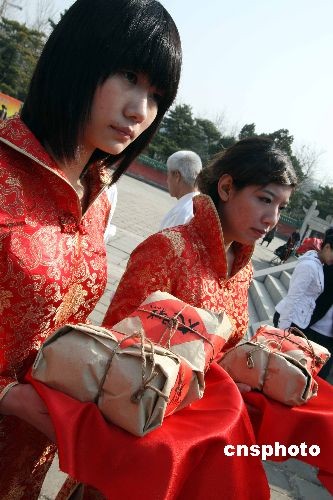 三月二十日,是中國二十四節(jié)氣中的春分。北京春分朝陽民俗文化藝術節(jié)閃亮登場,為中國這一第一批非物質文化遺產(chǎn)的傳承提供了展示的天地。北京春分朝陽民俗文化藝術節(jié)于二零零七年開始首創(chuàng),直至今年已經(jīng)舉辦了三屆,由于內容豐富多彩,為百姓喜聞樂見而深受歡迎。圖為現(xiàn)場將春分節(jié)令食品--太陽糕贈送給志愿者。中新社發(fā) 任海霞 攝