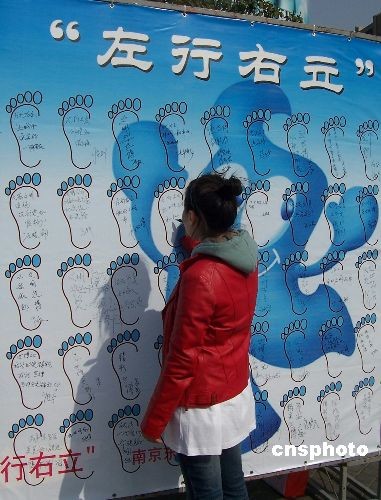 3月20日,上海黃浦區青年迎世博志愿者特別行動在南京路地鐵下沉式廣場舉行。現場設立迎世博文明墻,邀請市民參與世博文明倡議。并進行世博志愿者,左行右立地鐵文明乘梯、造血干細胞捐獻等志愿者的招募活動。中新社發 周東潮 攝