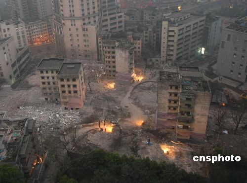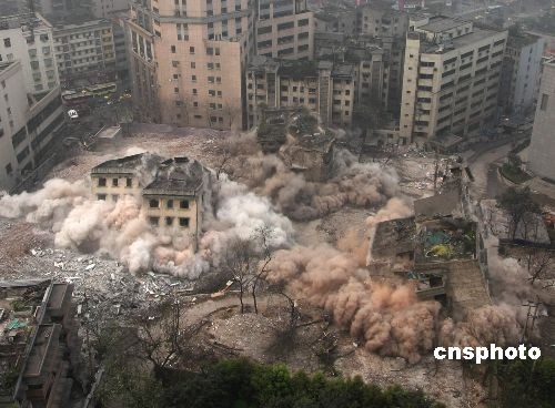 2009年3月21日,重慶江北區觀音橋處成功進行了危舊房定向爆破。當日早晨8時,一聲巨響,當地渝北二村二號地塊的6棟樓房被爆破拆除,總面積1000平方米。這是重慶2009年危舊房改造的第一爆,是觀音橋商圈快速推進“長江上游商貿中心”的重要舉措。中新社發 賀終榮 攝