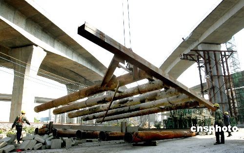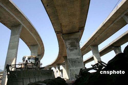 三月二十三日,福州市最大的高速公路互通立交橋——馬尾樞紐互通主體工程六十八座墩身和承臺已全面完成,將力爭在年底竣工。馬尾樞紐互通將興建四條高位匝道,匝道橋總長二千九百多米,位于沈海高速公路馬尾段,是福州機場高速公路二期工程的起點,通過青洲大橋與機場高速公路一期相連接,形成國際機場快速通道。中新社發 楊婀娜 攝