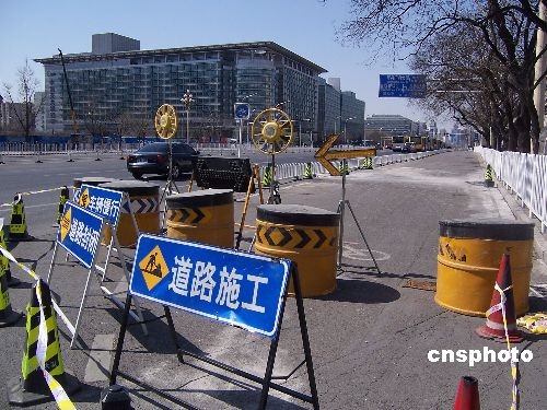 2009年3月25日,北京長安街西單文化廣場前非機動車道,近40平方米路面發生輕微沉降。事發后,該路面被交管部門臨時封閉。現場勘測人員介紹,沉降路面下方為地鐵四號線與一號線的換乘通道,此處路面沉降約1.85厘米。目前,相關工程暫停施工。中新社發 九州 攝