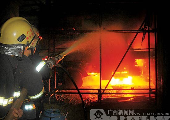 4月16日晚8時許,在南寧市仙葫開發(fā)區(qū)東方外國語學院的工地上,一輛灌漿車不明起火,引燃了油箱。經(jīng)消防隊員一個多小時的撲救,大火在當晚9時30分才被完全撲滅。