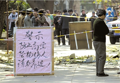 “像是地震,太可怕了!”住在3層的大媽臉色慘白,向眾人講述事發(fā)一幕。她說,當(dāng)時正在看電視,突然聽到“嘭”的一聲巨響,感覺大地一抖,聽到玻璃破碎和石頭砸落的聲音。